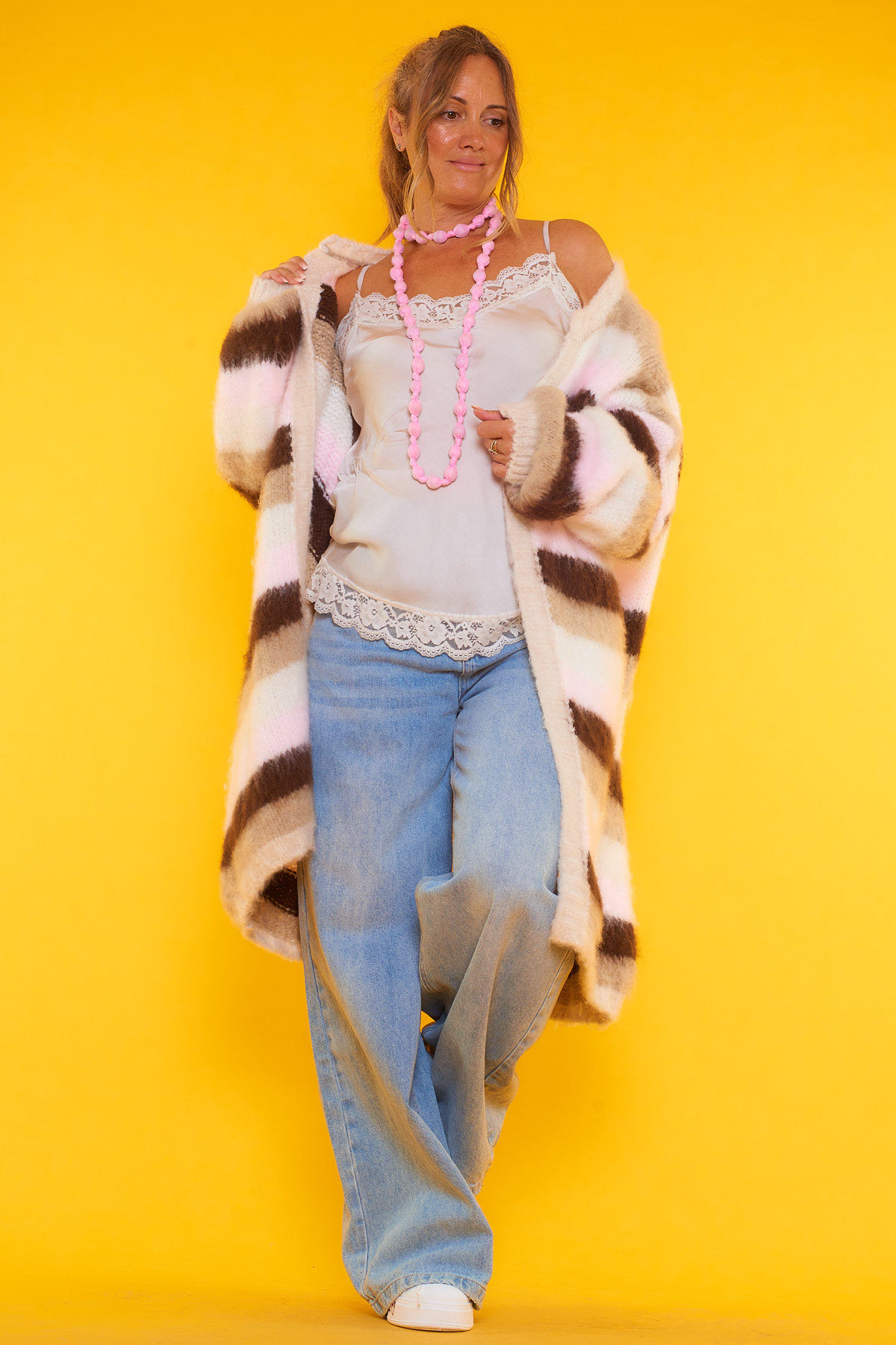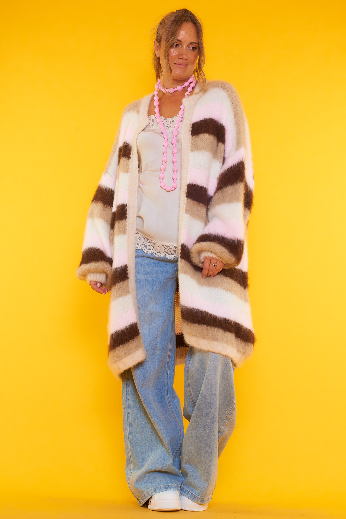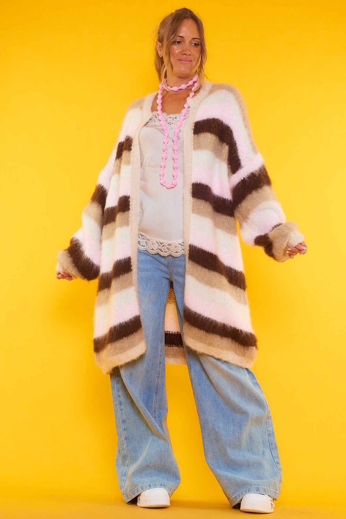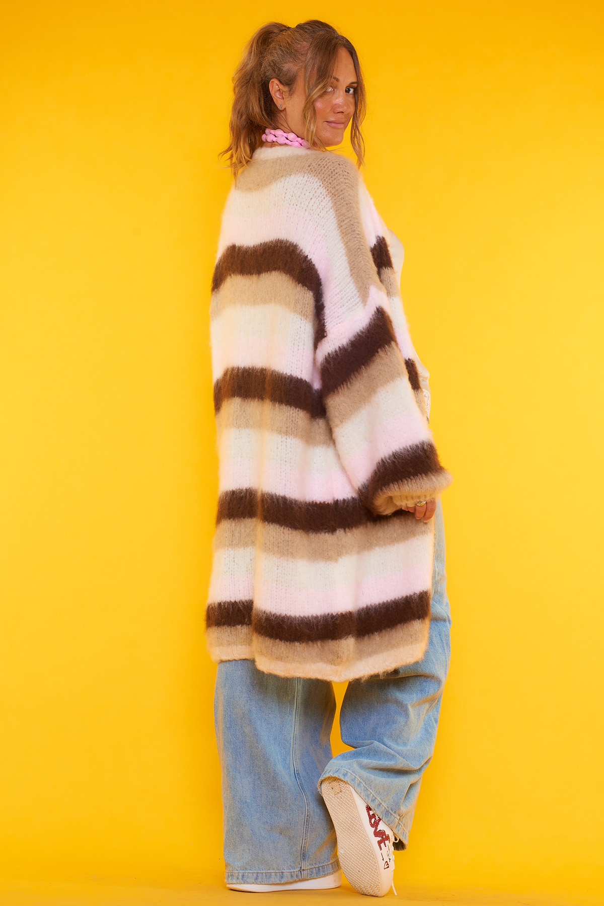 Un abrigo abierto que es muy elástico de múltiples colores que tiene un tejido extremadamente suave y cómodo.