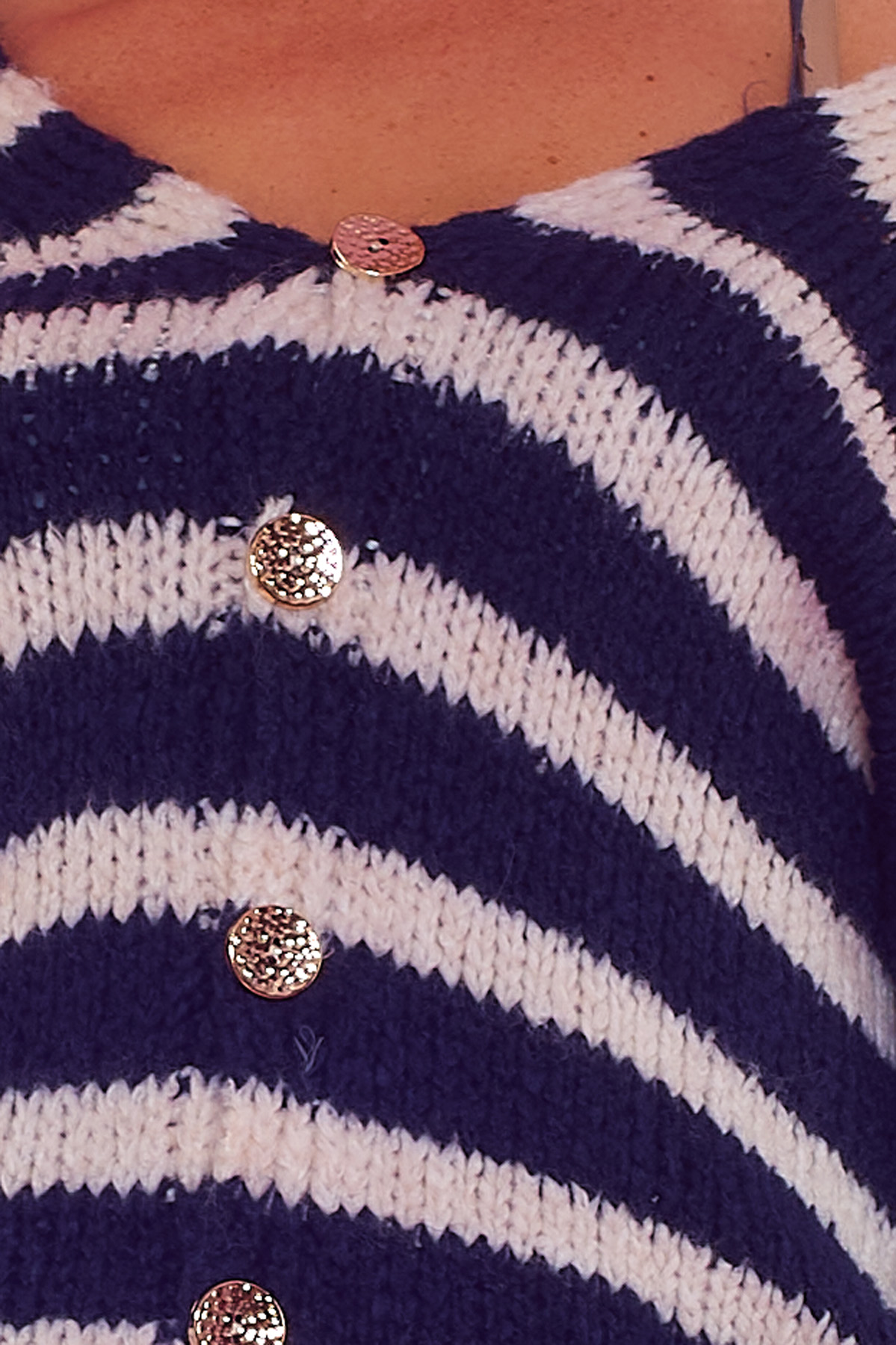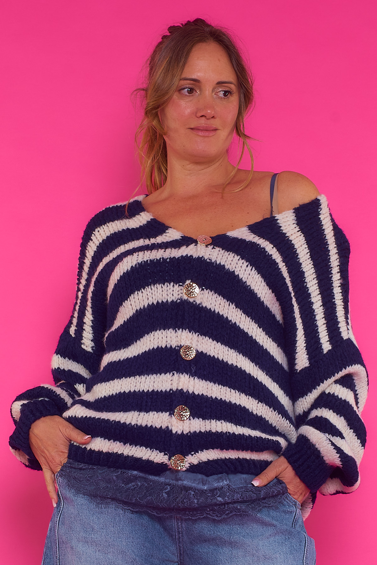 Una chaqueta elástica de punto que tiene escote en pico, cierre por medio de botones y un tejido extremadamente suave y agradable al tacto.