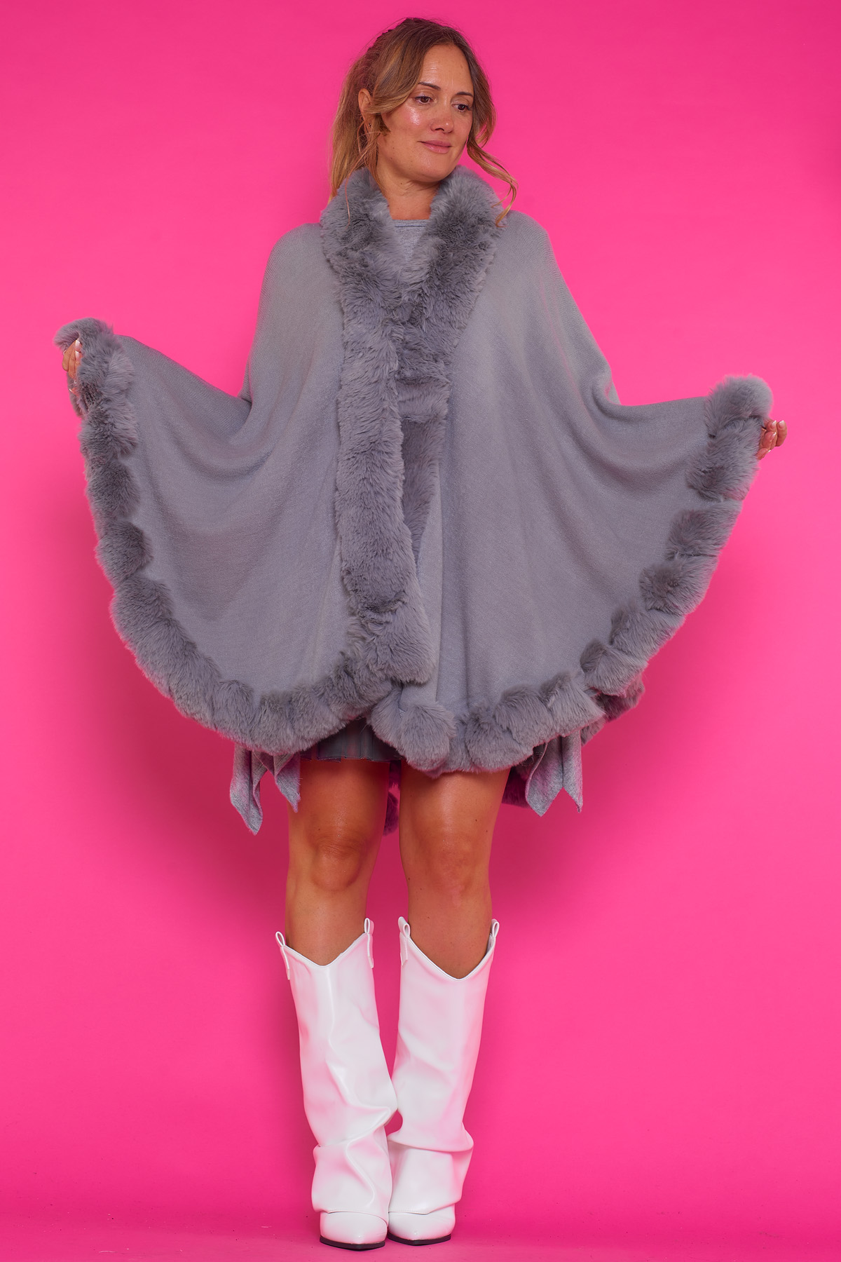 Un poncho que se puede cerrar por la parte superior y tiene pelito ultra suave y agradable al tacto en todos sus bordes.