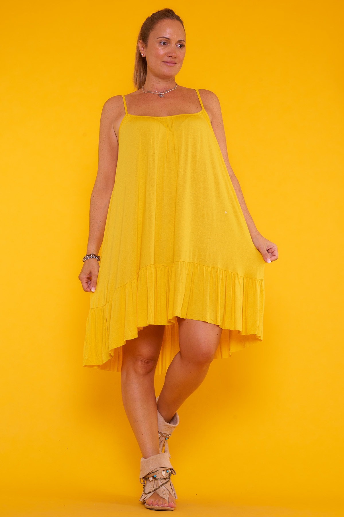 Un vestido corto de tirantes regulables que tiene un volante en la parte inferior.