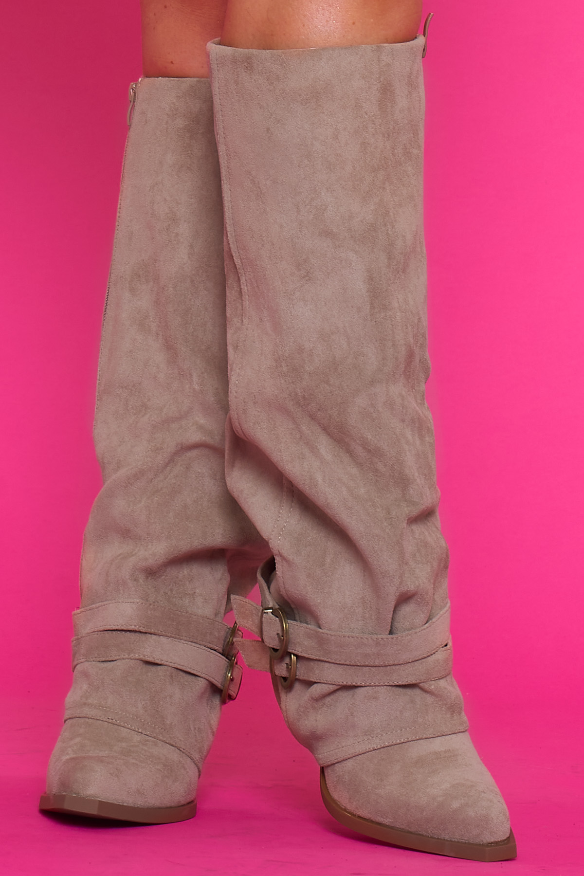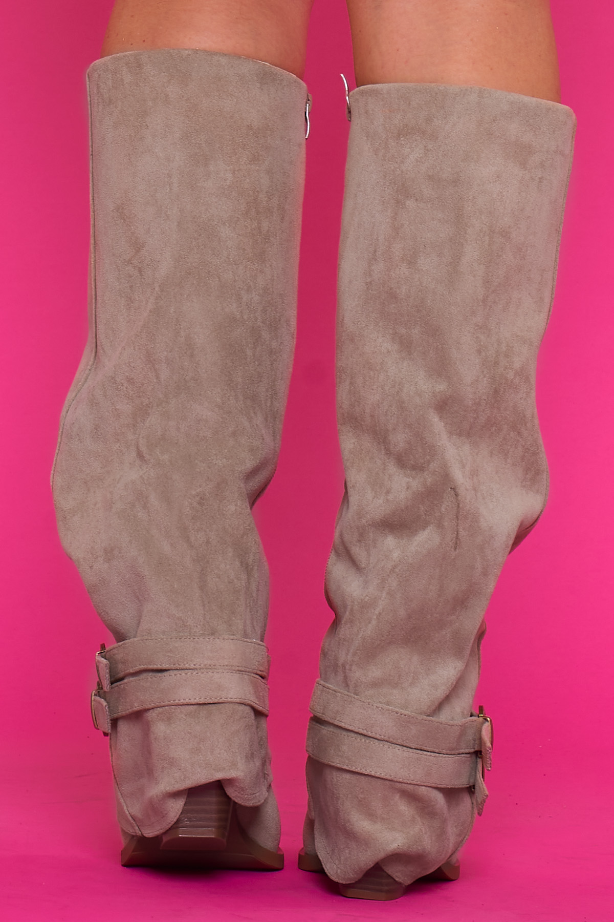 Unas botas altas que tienen cremallera para facilitar el acceso y unos pequeños cinturones con hebilla de decoración en la parte lateral inferior.