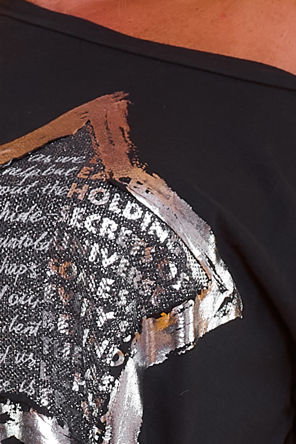 Una camiseta elástica de manga larga que tiene una tela muy suave y fresca. De decoración tiene lentejuelas y detalles color plateado brillante.