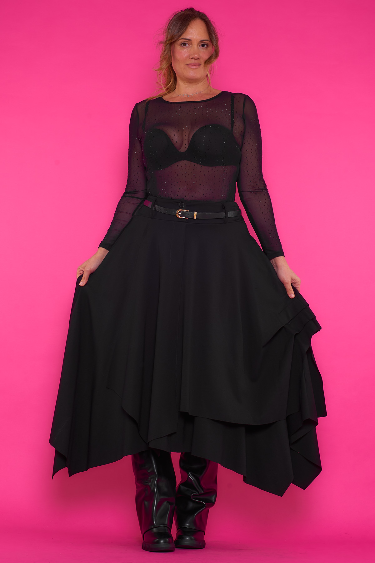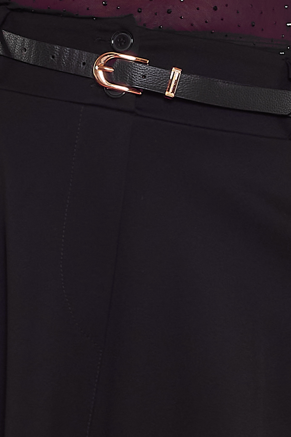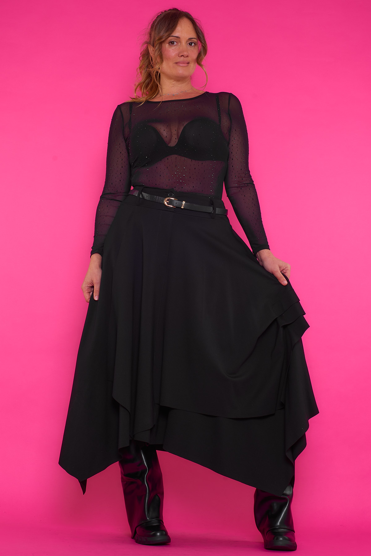Una falda elástica de corte asimétrico que tiene bolsillos y viene con un cinturón incluido. La prenda tiene en su cintura botones y una goma elástica.