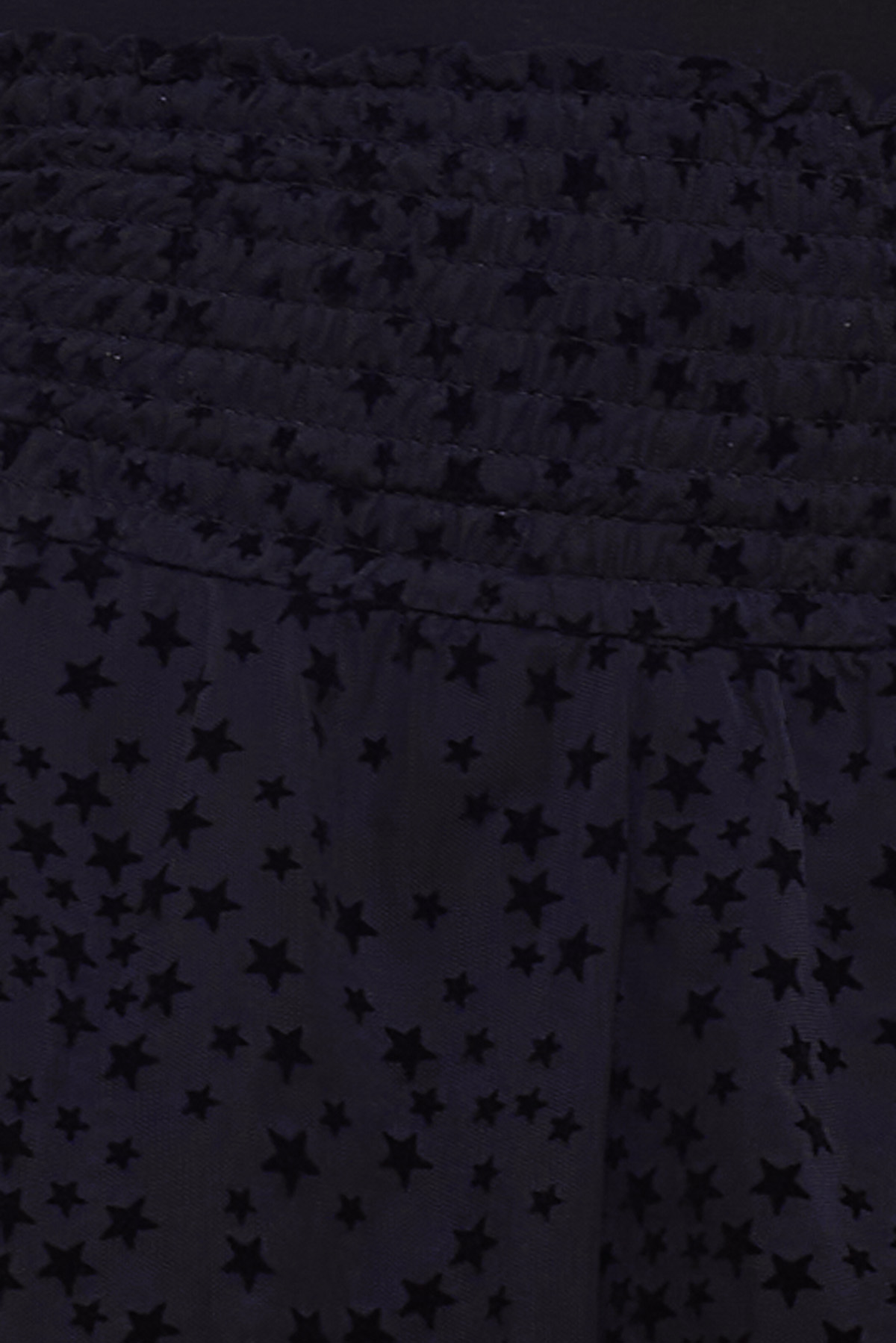 Una falda pantalón elástica que tiene nido de abeja en la parte superior y se caracteriza por tener volantes de tul con diseño de estrellas que estiliza la prenda por completo.