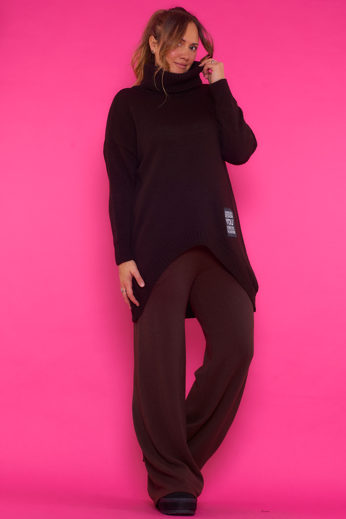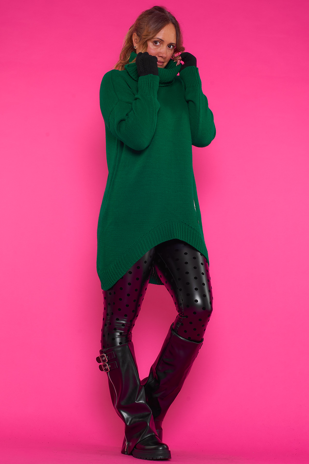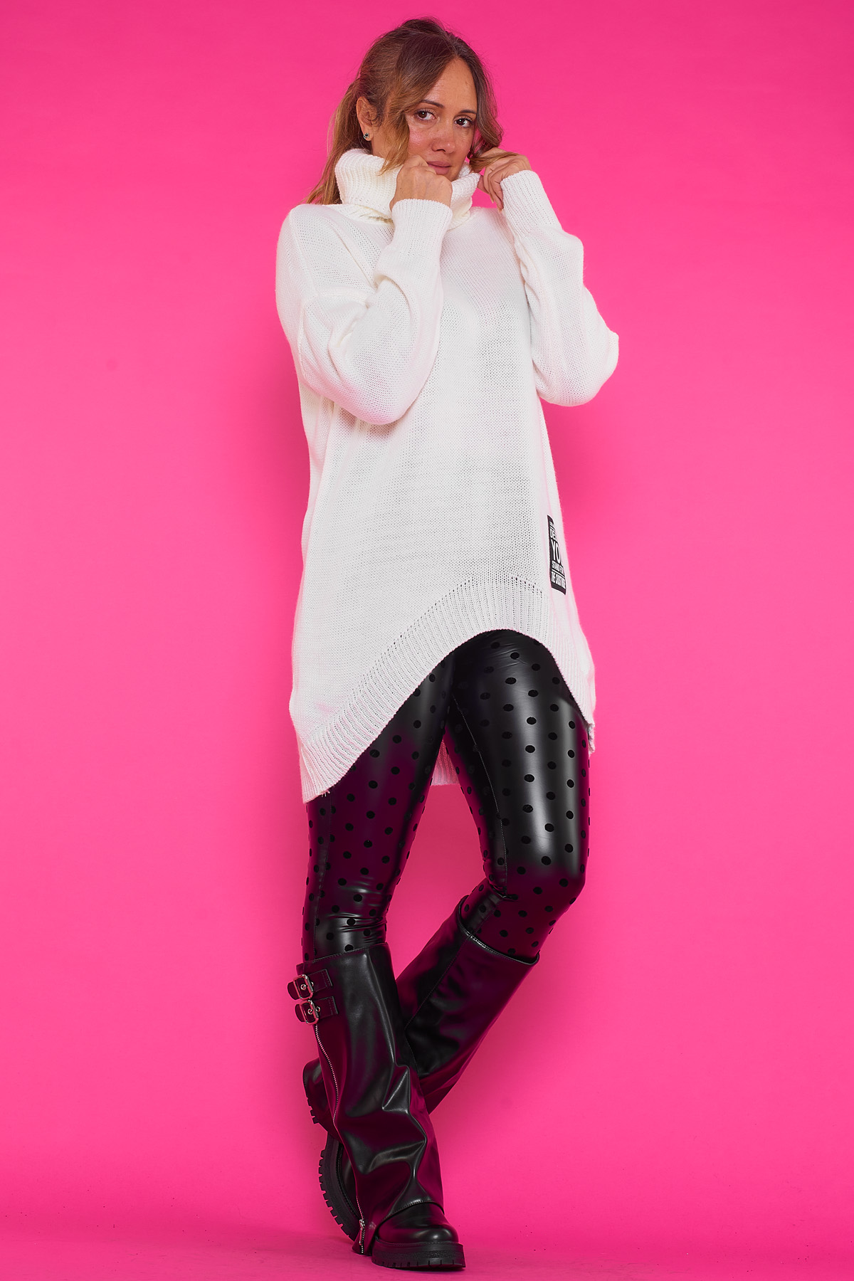 Un jersey elástico largo de punto que se caracteriza por tener cuello de tortuga y un corte asimétrico, teniendo su parte frontal mas larga que la trasera.