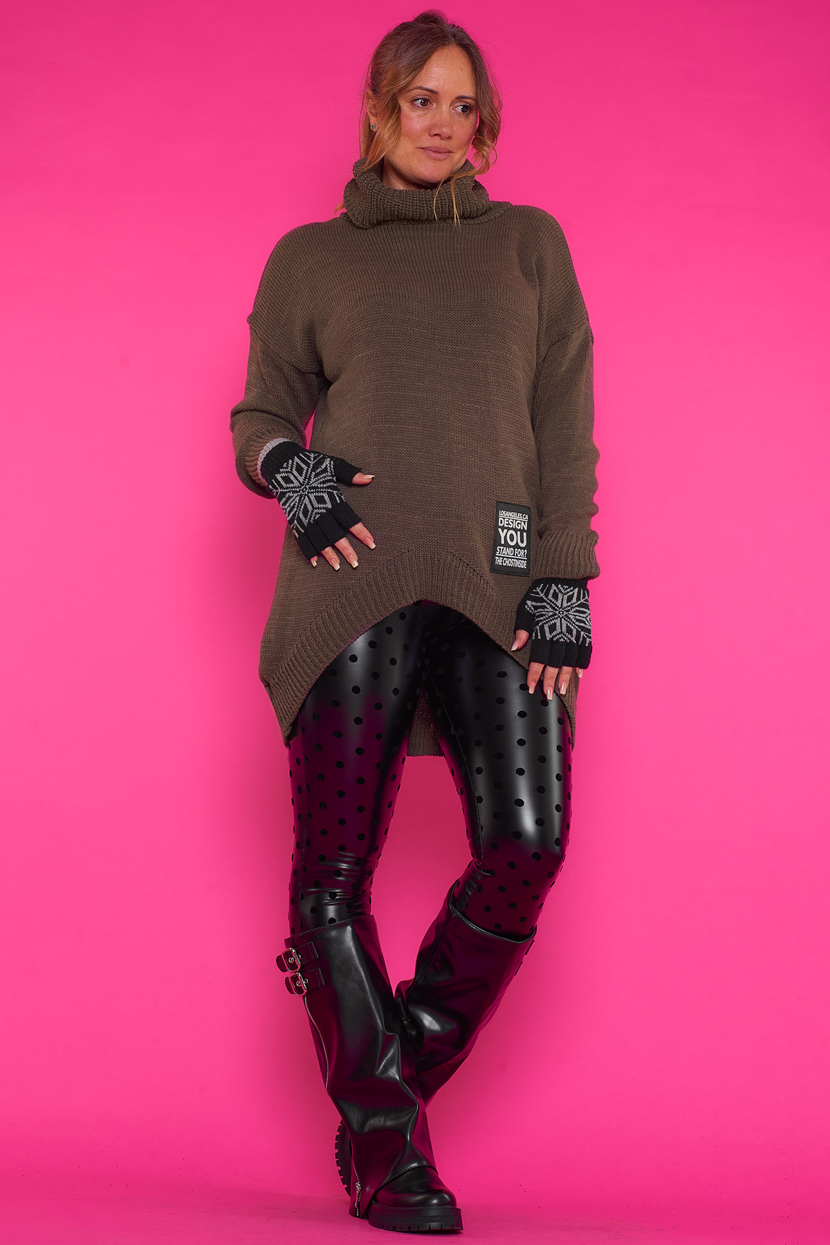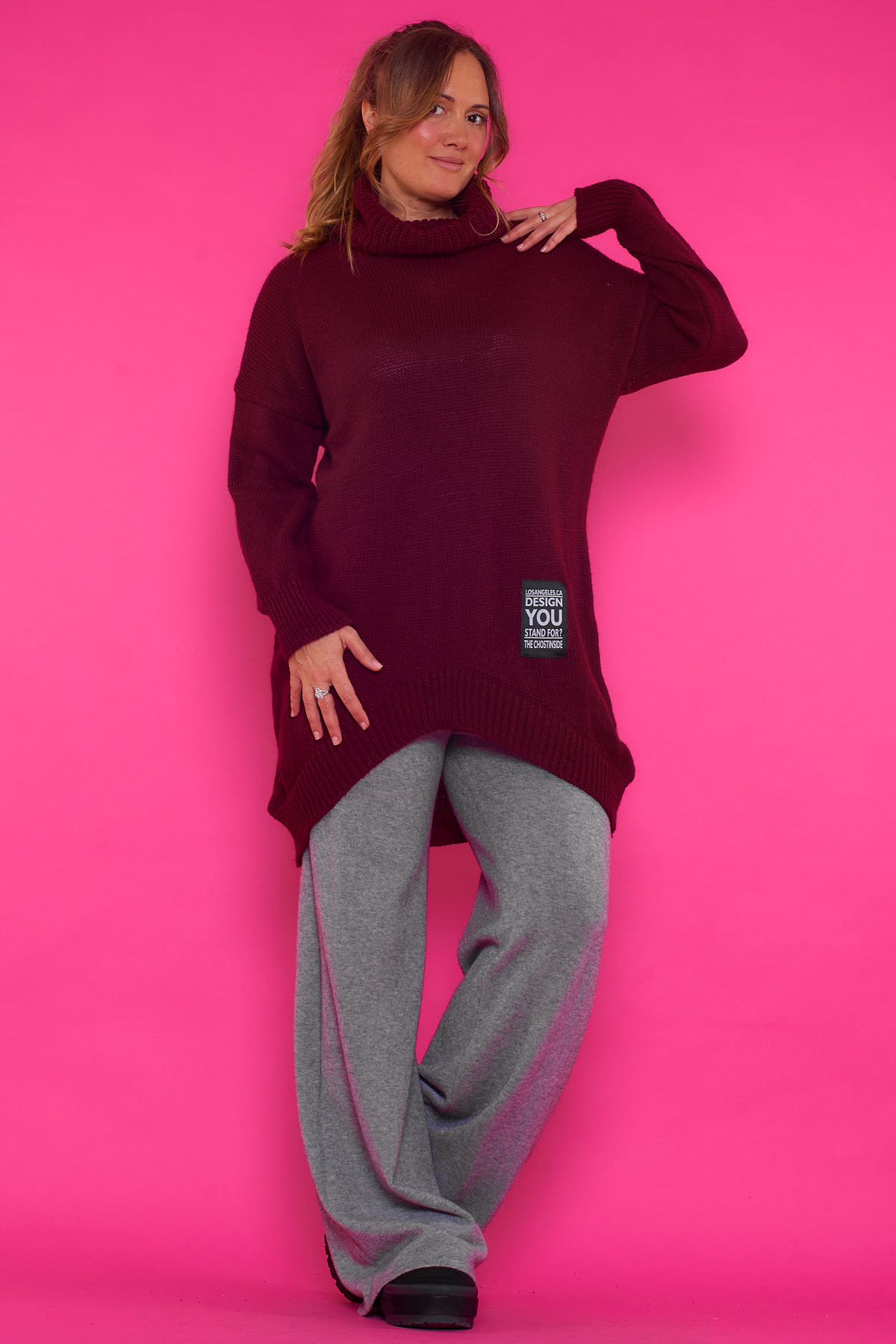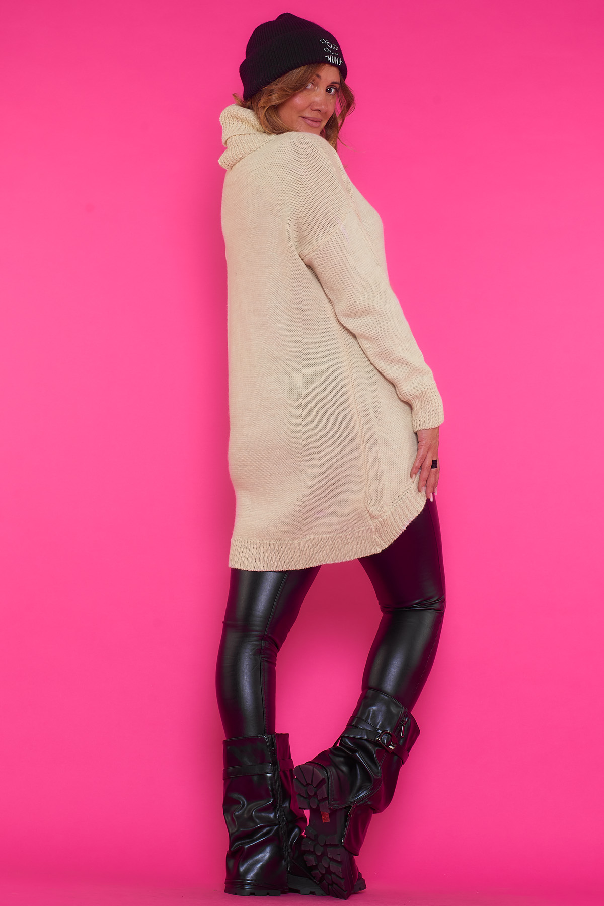 Un jersey elástico largo de punto que se caracteriza por tener cuello de tortuga y un corte asimétrico, teniendo su parte frontal mas larga que la trasera.