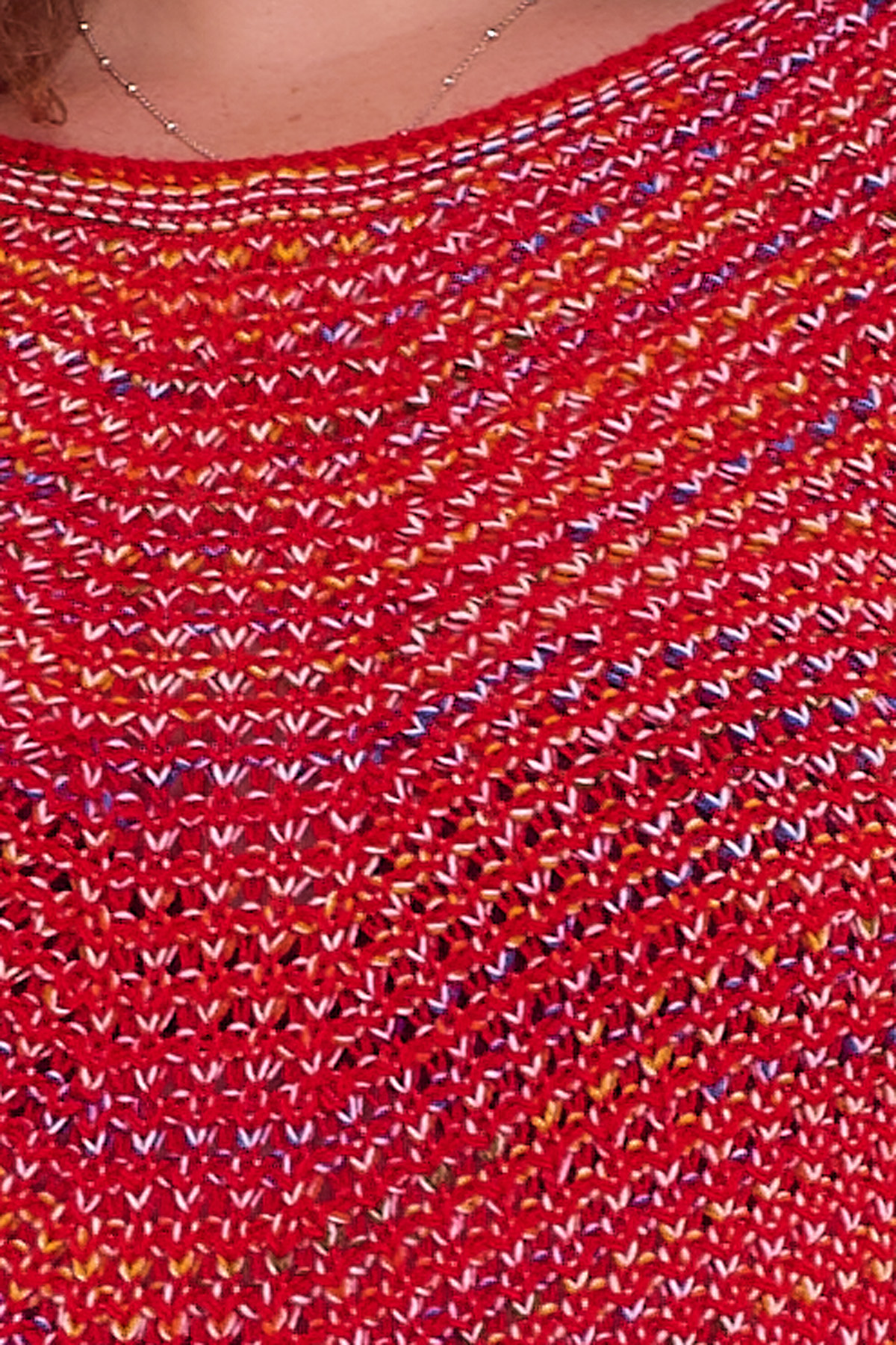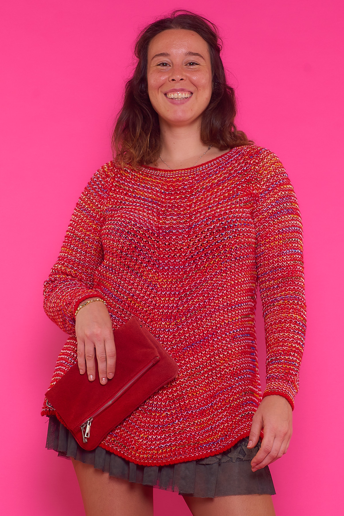 Un jersey elástico de manga larga que se caracteriza por tener un corte asimétrico y por su diseño original multicolor que estiliza la prenda por completo.