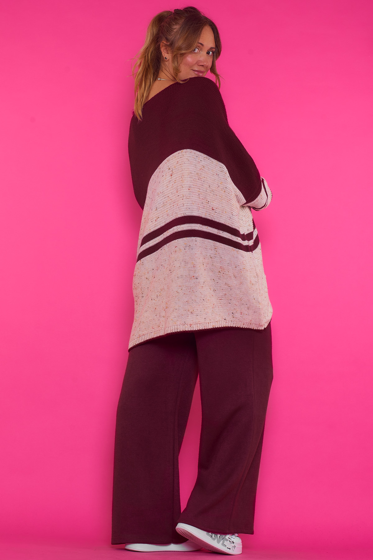Un jersey elástico de punto que tiene un escote amplio en pico. La prenda se caracteriza por ser de estilo oversize y por tener un corte asimétrico.