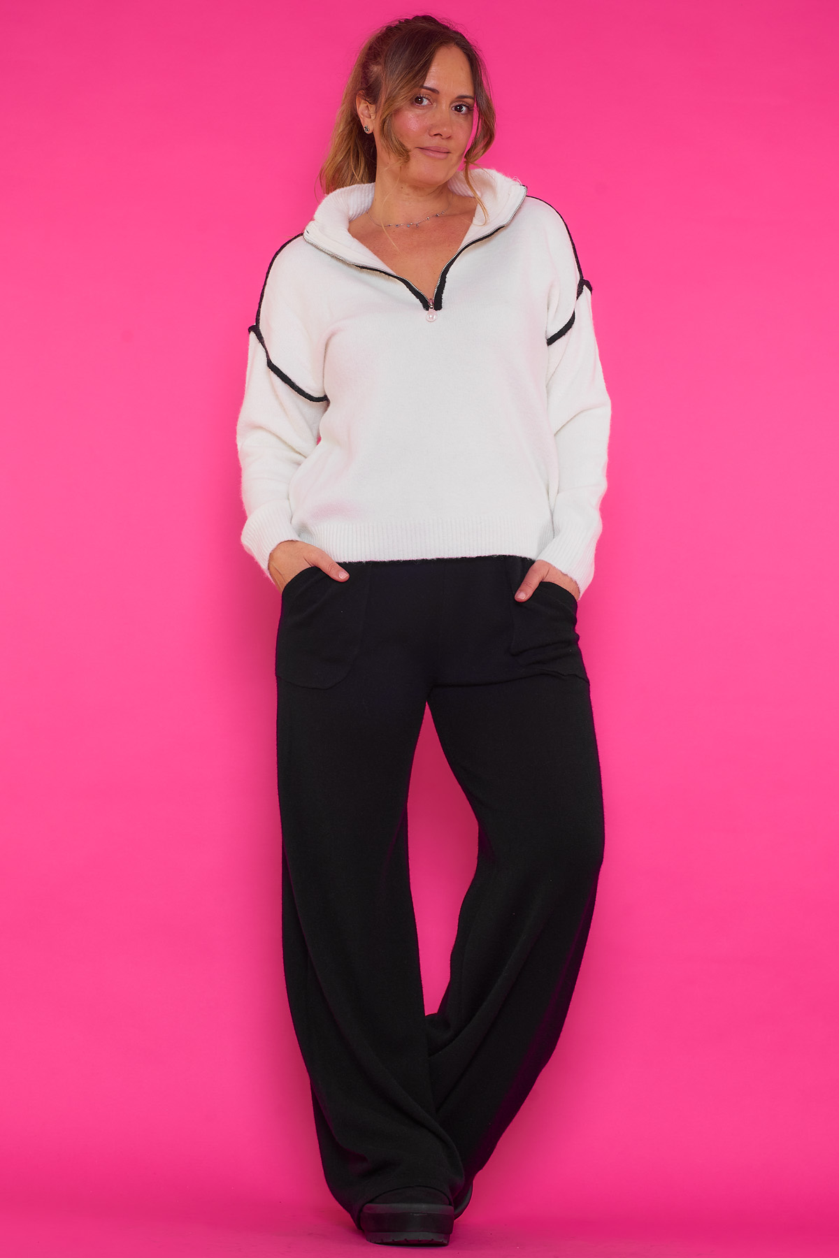 Un jersey elástico que tiene un tejido extremadamente suave y agradable al tacto. La prenda tiene cremallera en su escote.