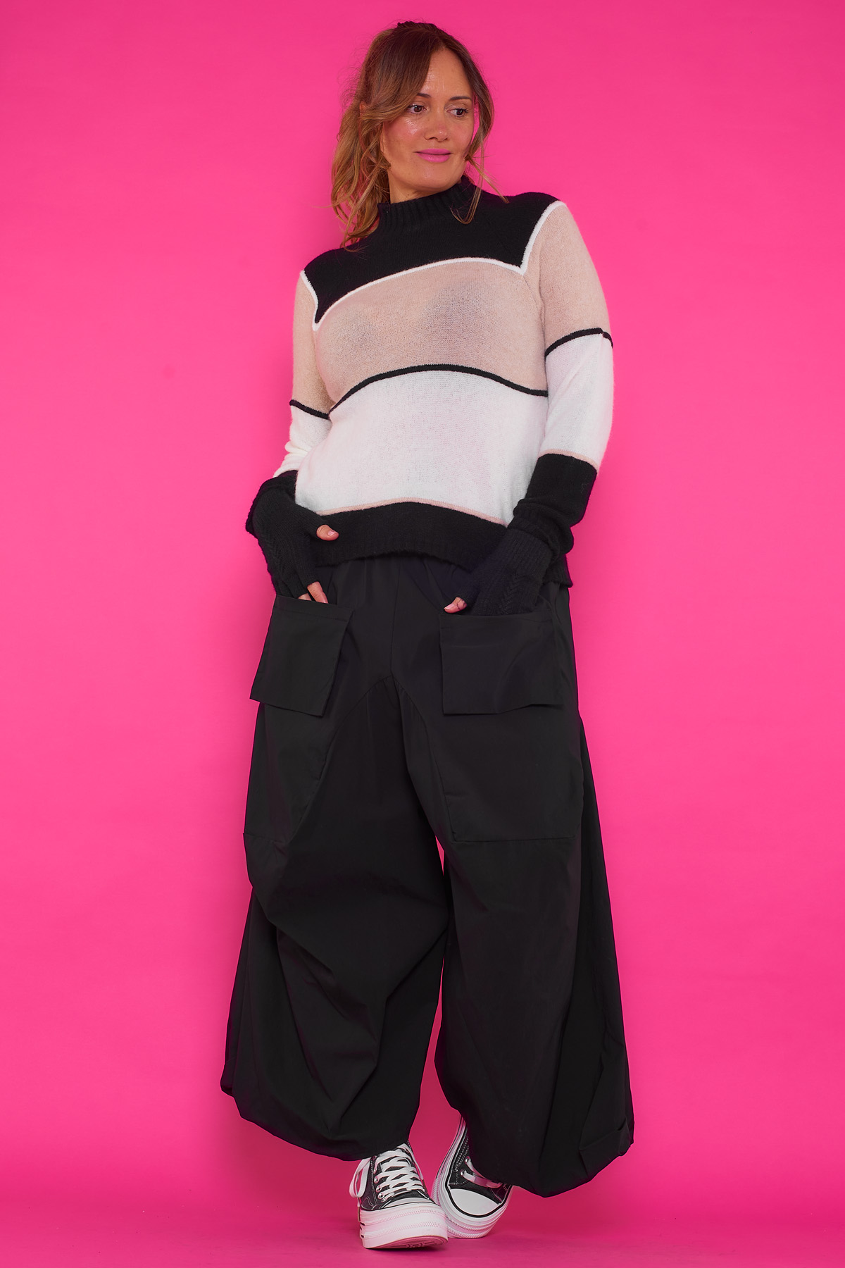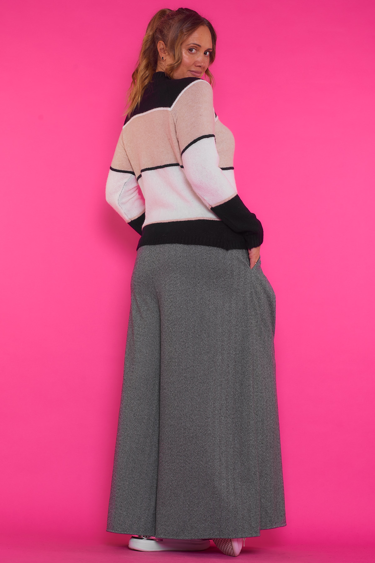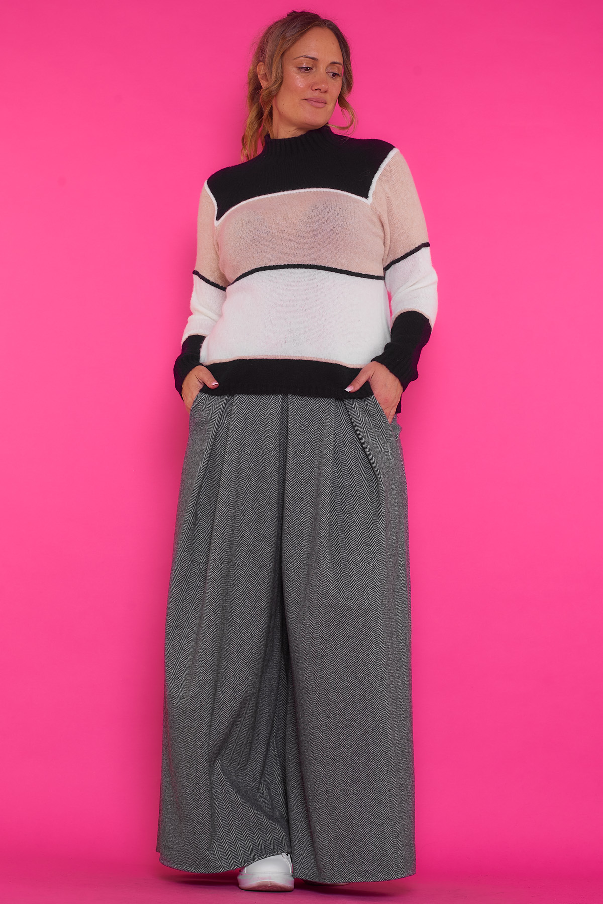 Un jersey elástico de punto que tiene cuello alto y un tejido extremadamente suave y agradable al tacto. Una pieza ideal para la temporada.