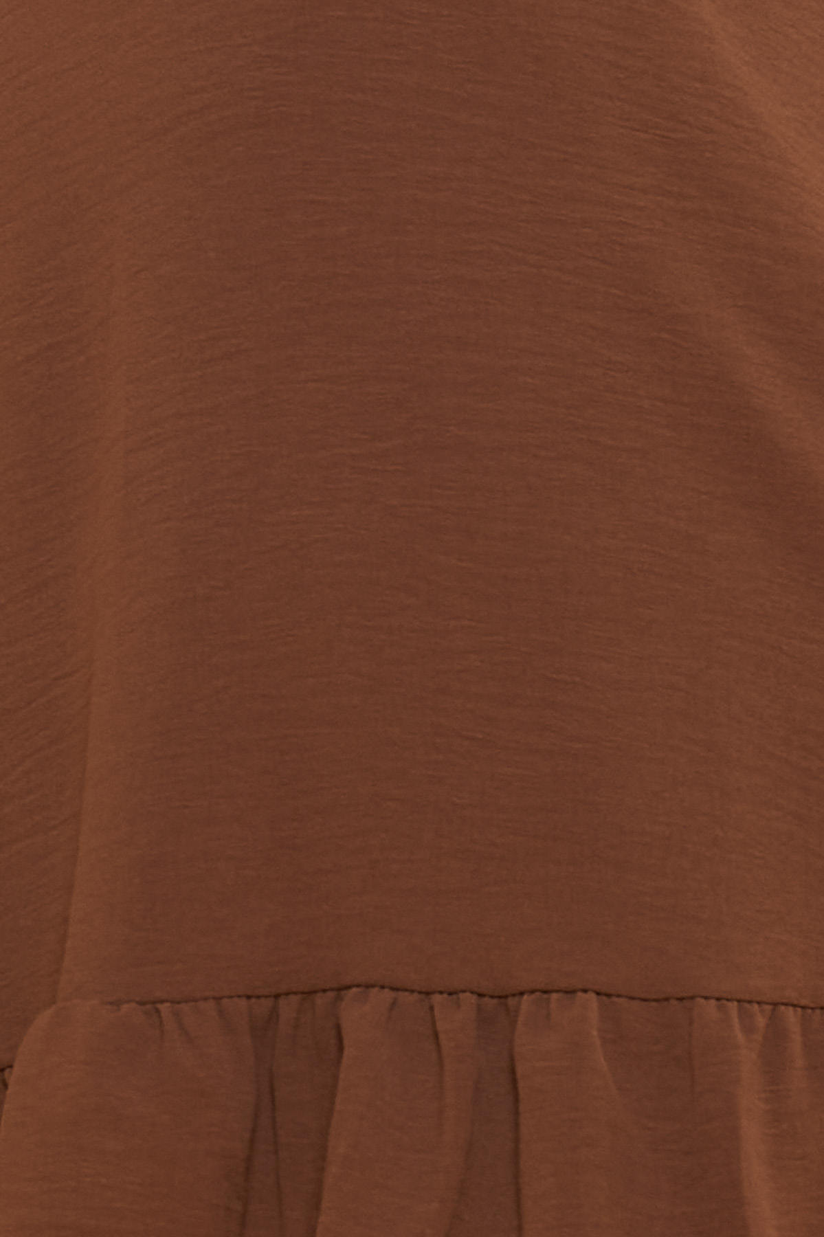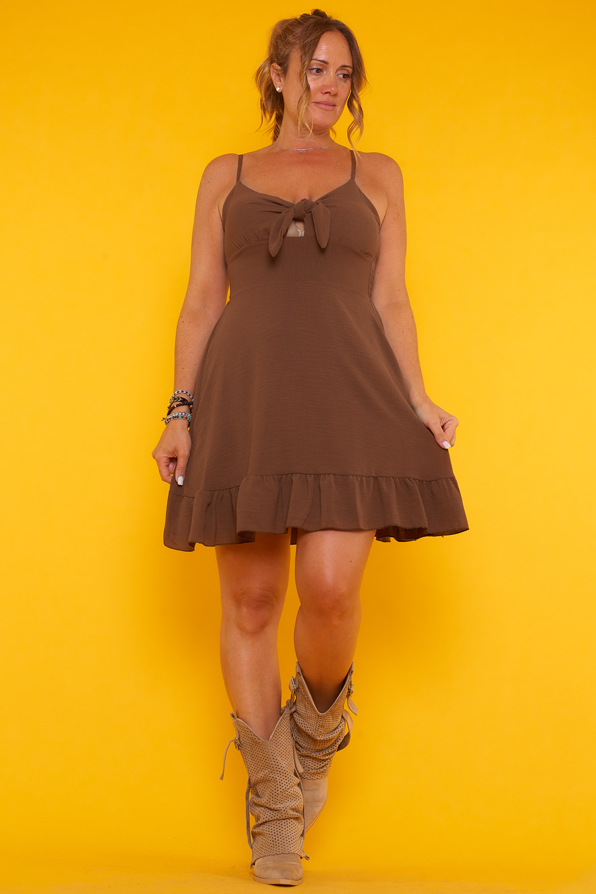 Un vestido corto elástico que tiene tirantes regulables, nido de abeja en la parte superior trasera y volantes en la parte inferior. En el escote tiene unas cintas para poder hacer un nudo en el escote que se puede regular a medida.