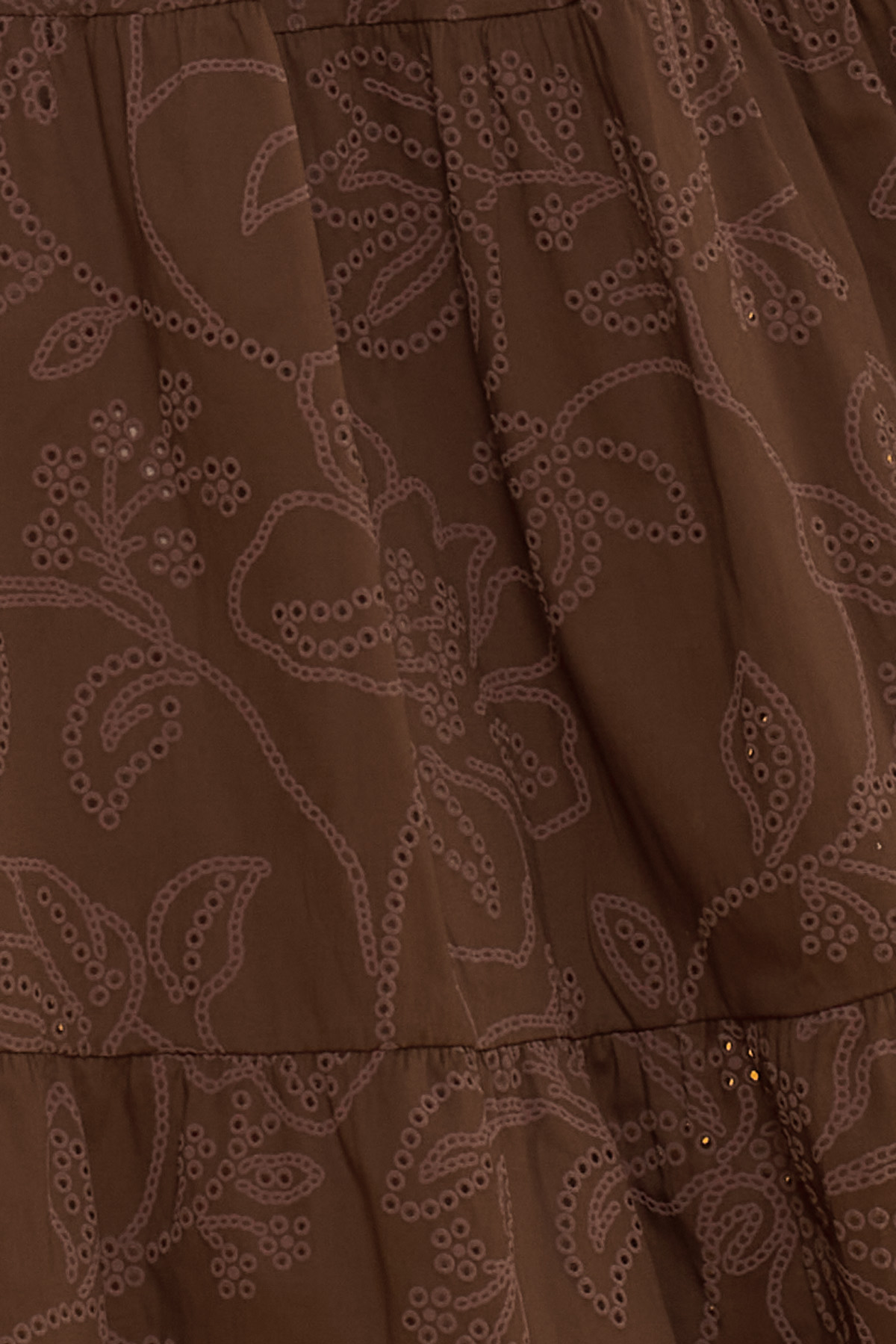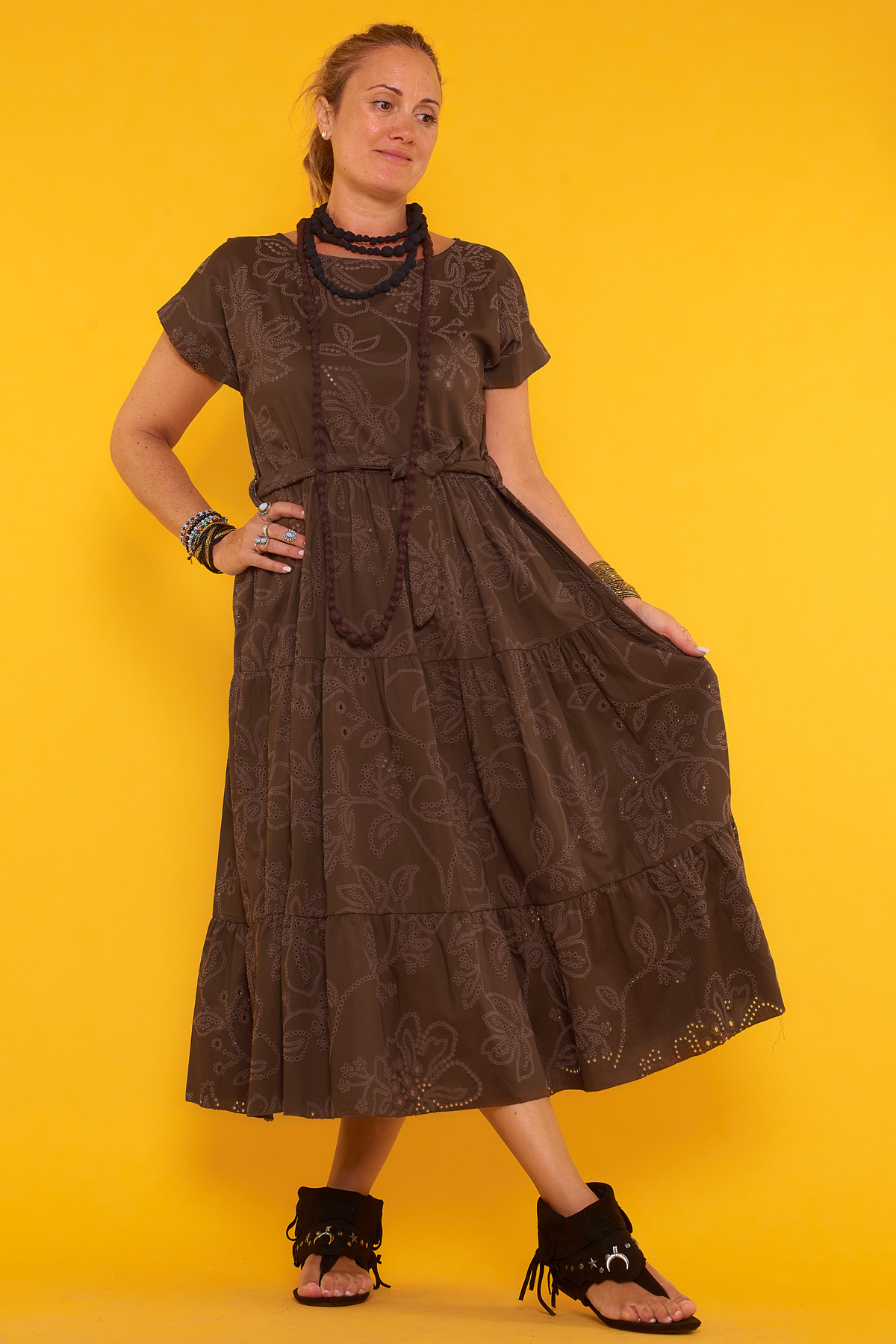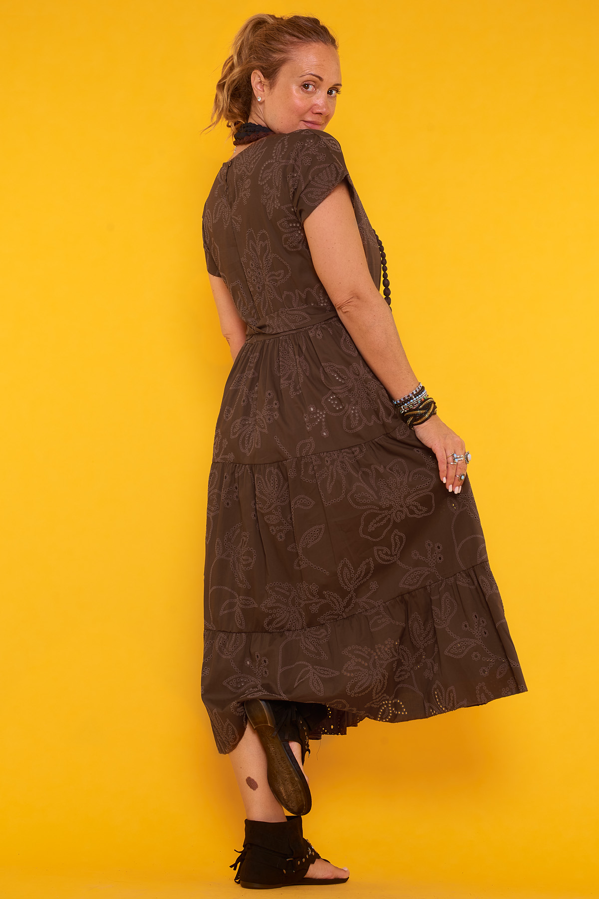 Un vestido largo que tiene manga corta, trabillas y un trozo de tela que funciona como cinturón. Su estampado tiene textura.