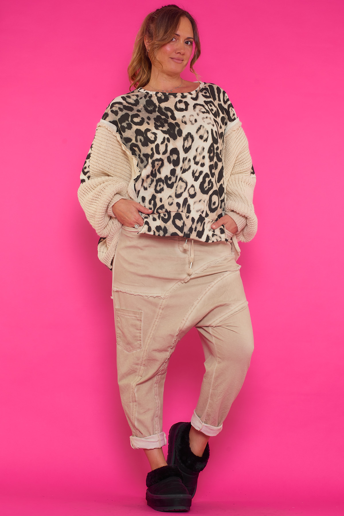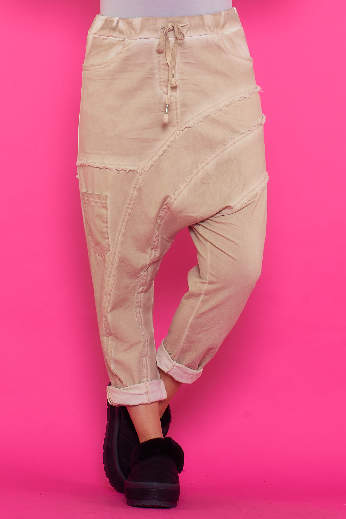 Un pantalón elástico de estilo baggy que tiene bolsillos laterales, bolsillos traseros y otro en su parte frontal. La prenda tiene una goma elástica en la cintura con cordones para ajustarla a mejor medida.
