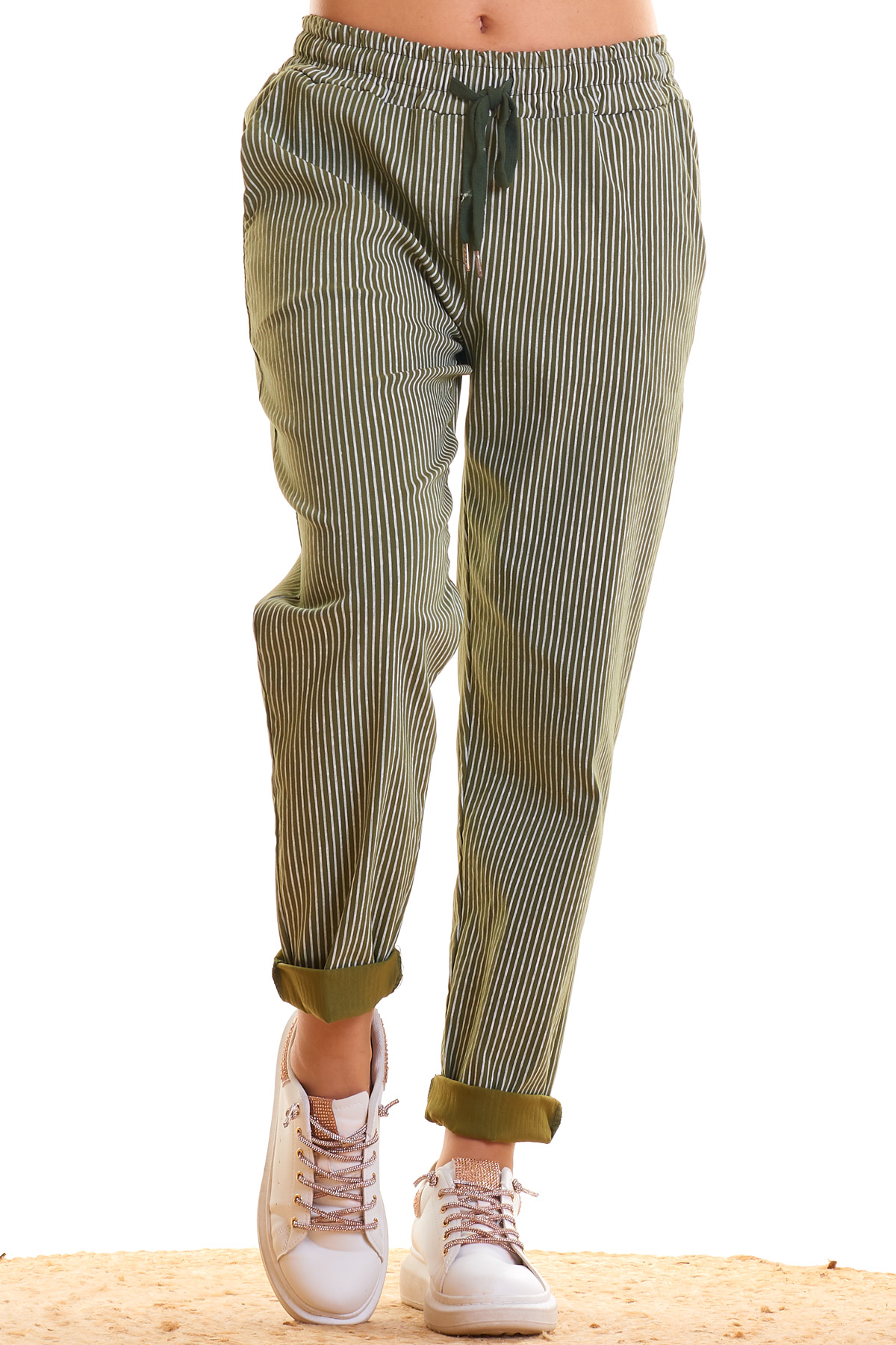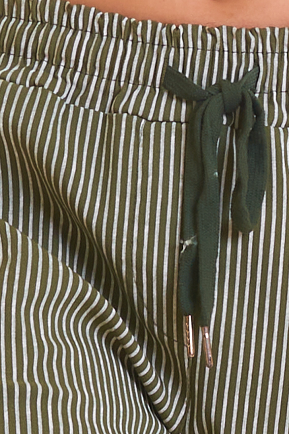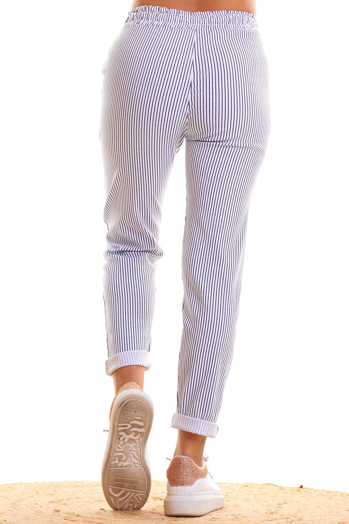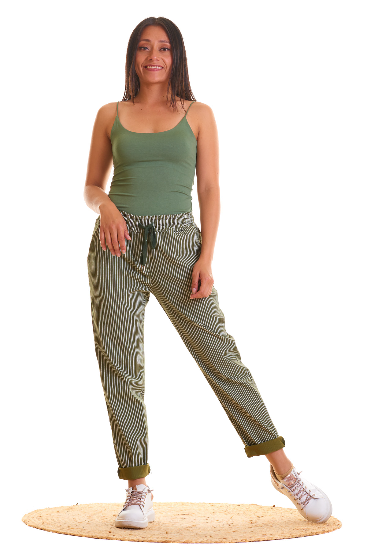 Un pantalón que es elástico de la cintura y de las piernas. Tiene bolsillos laterales y cordones regulables.