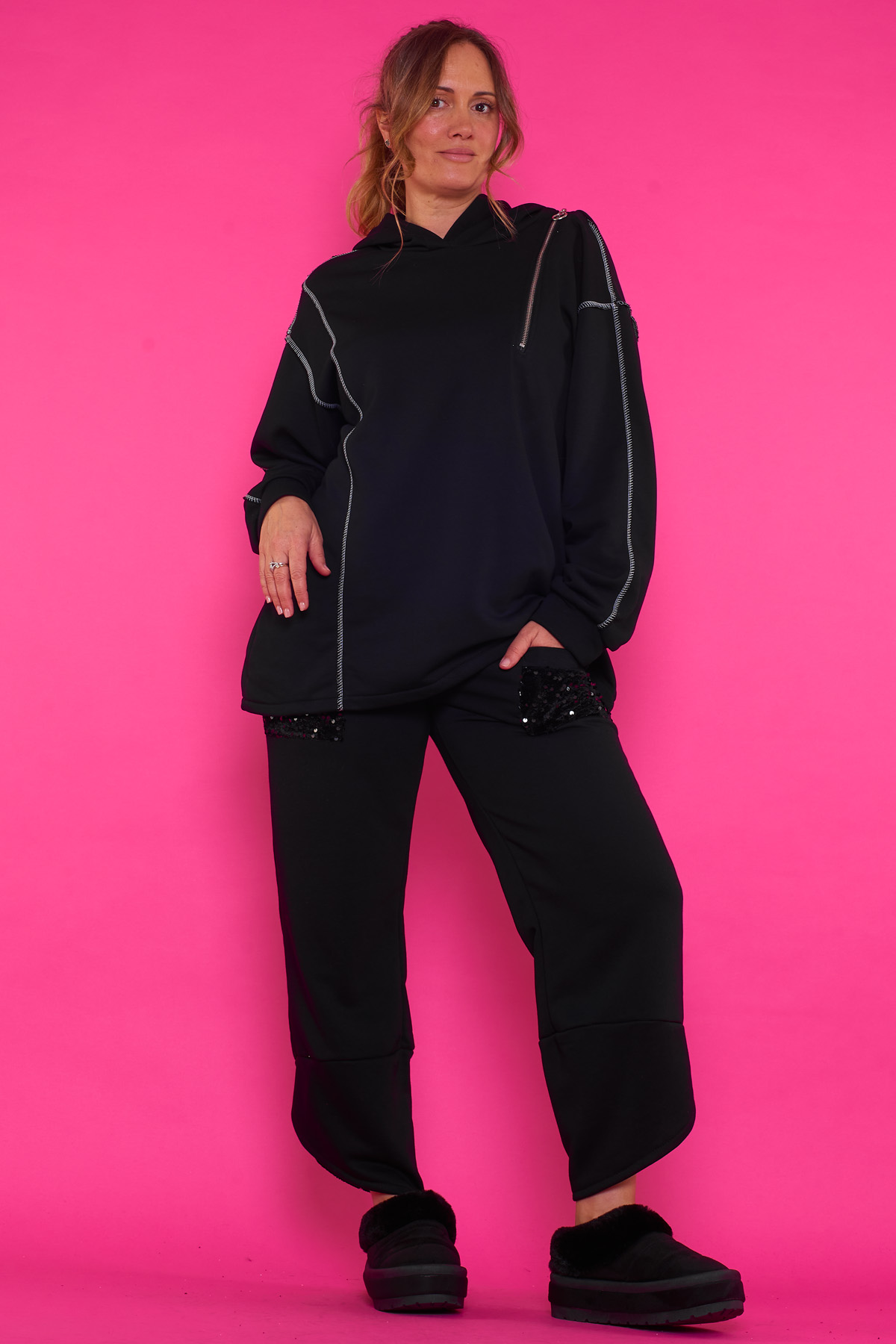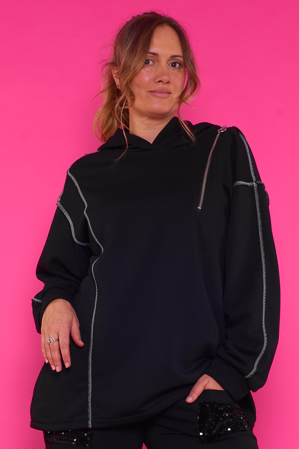 Una sudadera elástica que tiene capucha y que se caracteriza por tener una cremallera que revela un estampado oculto que estiliza la prenda por completo. Una pieza con un diseño creativo y original.