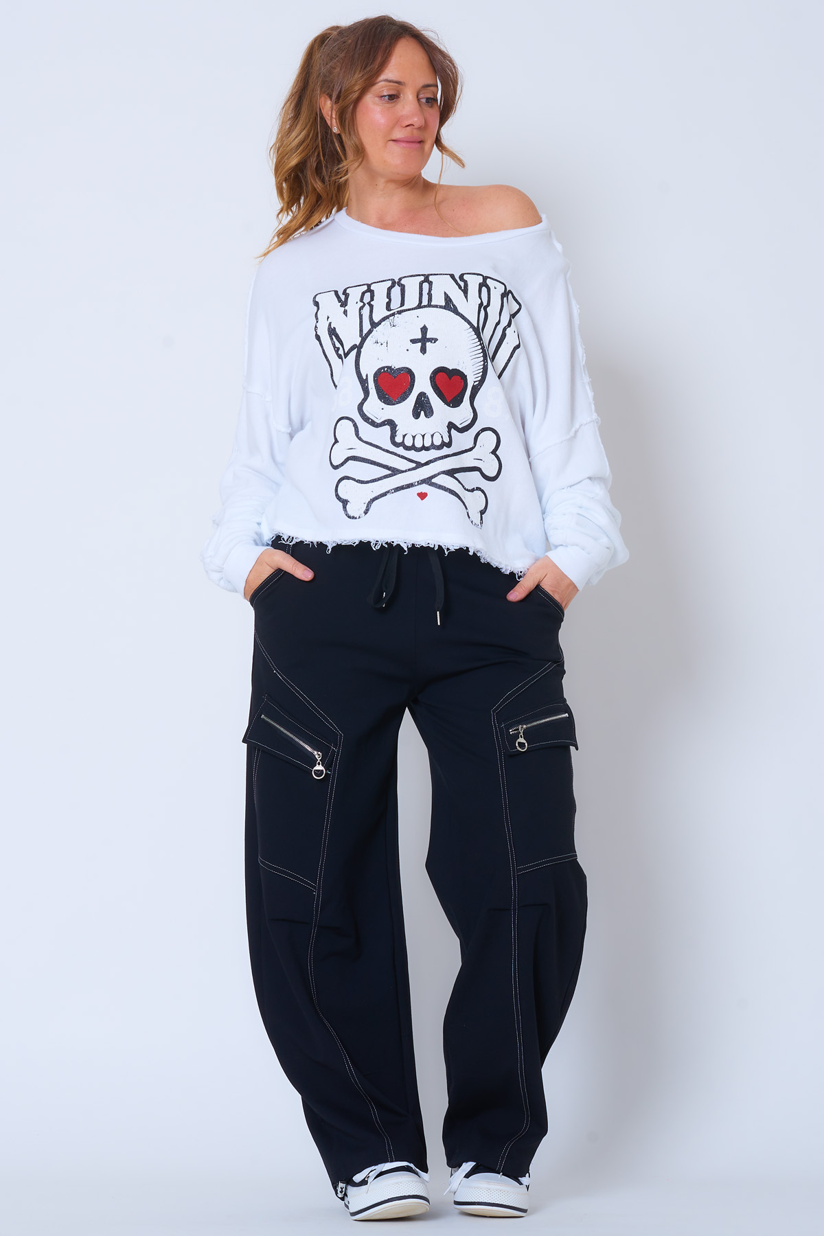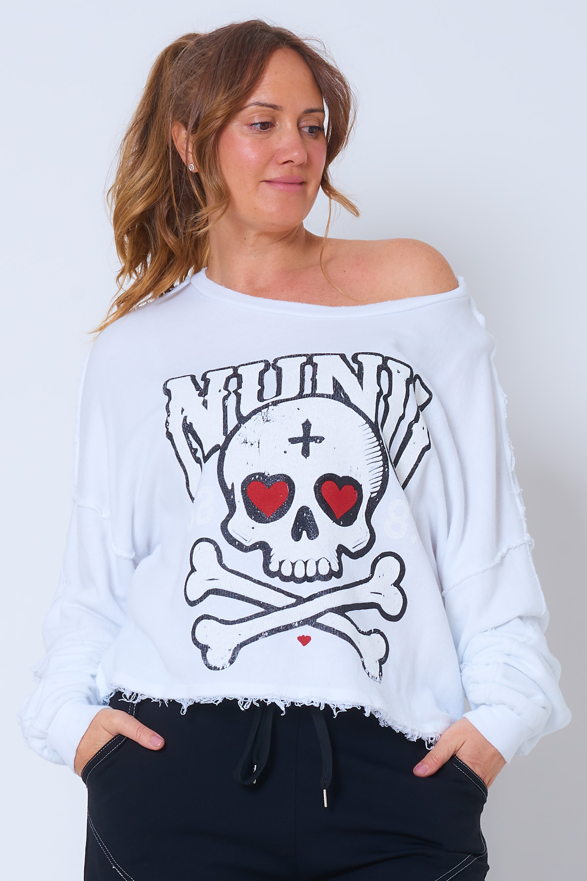 Una sudadera elástica que se caracteriza por tener nuestro nunu estampado en la parte frontal, un diseño creativo y original que aporta mucho estilo a la pieza. La prenda tiene en su interior un tejido estilo toalla y en su exterior detalles deshilachados al igual que decoración de tejidos expuestos. Una sudadera imprescindible de la temporada ideal para las más fanáticas.