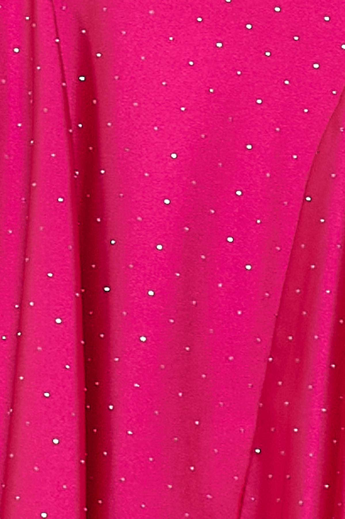 Un vestido corto elástico de tirantes regulables que tiene unas cintas en la parte trasera para poder hacer un nudo decorativo. Esta prenda se caracteriza por tener un drapeado en la parte frontal del escote y por tener strass esparcidos en toda la prenda.