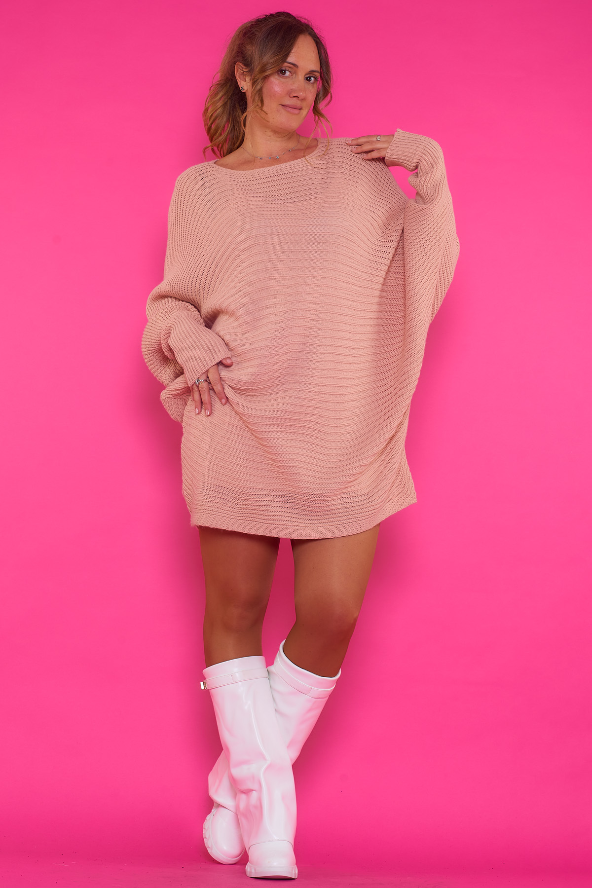 Un vestido corto que es elástico de estilo oversize. Es de tela extremadamente suave y agradable al tacto. Es ligeramente asimétrico teniendo la parte trasera más larga que la frontal.